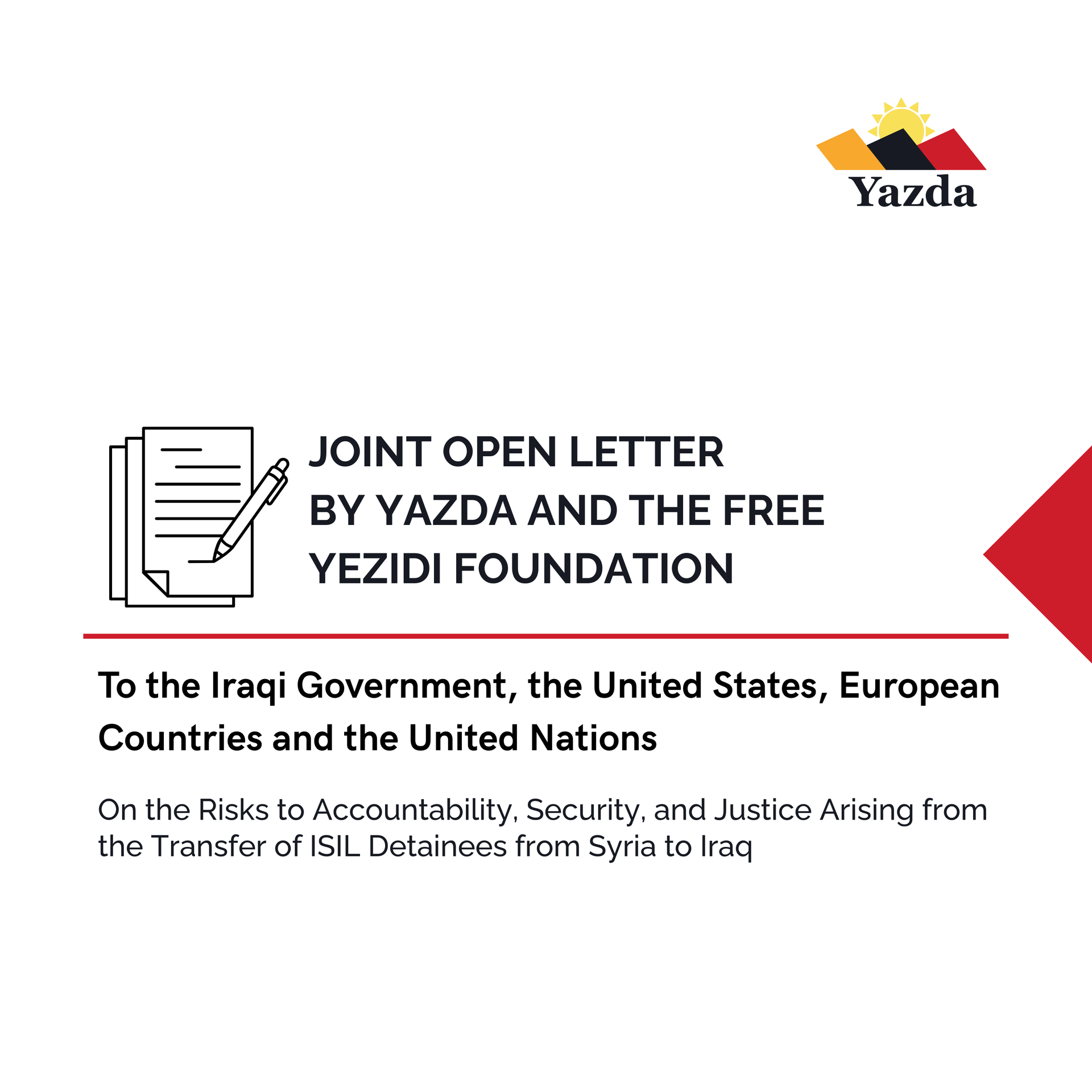January 23, 2026 Joint Open Letter By Yazda and the Free Yezidi Foundation to the Iraqi Government, the United States, European Countries and the United Nations On the Risks to Accountability, Security, and Justice Arising from the Transfer of ISIL Detainees from Syria to Iraq We, the undersigned organizations, write to express our deep concern regarding the transfer of ISIL detainees from northeastern Syria to Iraq at a time of heightened regional instability. According to publicly available information , 150 ISIL detainees have already been transferred, and plans are reportedly underway that could involve the transfer of up to 7,000 ISIL prisoners, including Foreign Terrorist Fighters (FTFs). Although we recognize the complex security challenges faced by Iraq and its partners, large-scale transfers carried out without an internationally supported accountability framework risk undermining justice efforts, regional and global security, social cohesion, and long-term stability. These transfers are taking place amid ongoing attacks by Syrian Government forces and affiliated armed groups against the Syrian Democratic Forces (SDF) that had been holding ISIL detainees for several years. The attacks are affecting detention facilities and displacement camps. This includes Al-Hol camp, which continues to host tens of thousands of individuals with alleged ISIL links and has long been recognized as a highly fragile environment with significant protection and radicalization risks. The deteriorating security environment in northeastern Syria heightens the risk of ISIL and extremist resurgence, posing a direct threat to civilians, including ethnic and religious minorities, such as Yazidis, in both Syria and Iraq. In this context, the movement of large numbers of ISIL detainees raises legitimate concerns about safety, oversight, and Iraq’s capacity to manage, without sustained international support, a significantly increased number of ISIL prisoners while ensuring meaningful accountability. We therefore underscore the urgent need for full transparency, coordination, and international engagement throughout the process, including sustained support for the SDF, who for more than a decade have played a critical role in protecting civilians, securing detention facilities, and preventing ISIL resurgence on behalf of the international community. Our organizations were established in direct response to ISIL’s genocide against the Yazidi community and its systematic targeting of all those who opposed or did not conform to its extremist ideology. For more than a decade, together with survivors from Yazidi, Christian, Shia Turkmen, Shabak, and other affected communities, we have consistently called for accountability that reflects the full scope and gravity of ISIL crimes. To date, accountability efforts have remained limited. In Iraq, ISIL members have largely been prosecuted under terrorism-related charges, leaving core crimes, such as genocide, crimes against humanity war crimes, sexual violence, killings, torture, enslavement, forced indoctrination and militarization, and forced displacement, unaddressed in judicial proceedings. This approach has prevented the establishment of an authoritative judicial record of ISIL crimes committed against all affected communities and has excluded survivors from meaningful participation in justice processes. Accountability for ISIL crimes is not only a legal obligation but a necessary foundation for reconciliation, sustainable peace and global security. Prosecuting ISIL members for genocide, crimes against humanity, and war crimes is essential to reveal the systematic and multi-community nature of ISIL violence, counter denial and historical distortion, and ensure that responsibility is attributed to individual perpetrators rather than entire communities. Credible justice processes can therefore reduce grievances, prevent collective blame, strengthen trust in state institutions, and contribute to long-term stability and non-recurrence. While we are deeply concerned by current developments, particularly the rise of extremist behaviour and targeted attacks against ethnic and religious minorities, we also recognize that this presents an important moment for Iraq to combat impunity. Iraq has taken meaningful steps toward recognition and accountability for ISIL crimes, including the adoption of a groundbreaking reparations framework, the Yazidi Survivors Law, and ongoing efforts to exhume mass graves of ISIL victims across the country. These exhumations are uncovering critical evidence of atrocities committed against multiple communities and underscore the urgent need for prosecutions that reflect the full extent of these crimes. Without corresponding judicial processes that hold perpetrators individually responsible, these efforts risk remaining incomplete and falling short of survivors’ expectations for justice and truth. Iraq’s recent election to the United Nations Human Rights Council for the 2026-2028 term and its National Action Plan on Human Rights further provide a framework for strengthened international cooperation on accountability. With coordinated international support, Iraq can transform these efforts into a comprehensive justice process that establishes the truth about ISIL crimes against all affected communities, strengthens social cohesion, and contributes to durable peace and non-recurrence. Despite the passing of time, survivors continue to express a clear and consistent demand for justice. In a recent survey conducted by Yazda with 601 survivors, more than 98% emphasized the importance of prosecuting ISIL members for genocide and crimes against humanity, and 95% rejected any form of amnesty. These views reflect not only a desire for accountability, but for truth, recognition, and a future free from recurrence. In light of the above, we respectfully call for the following actions: To the Iraqi Government Ensure full transparency and oversight regardin