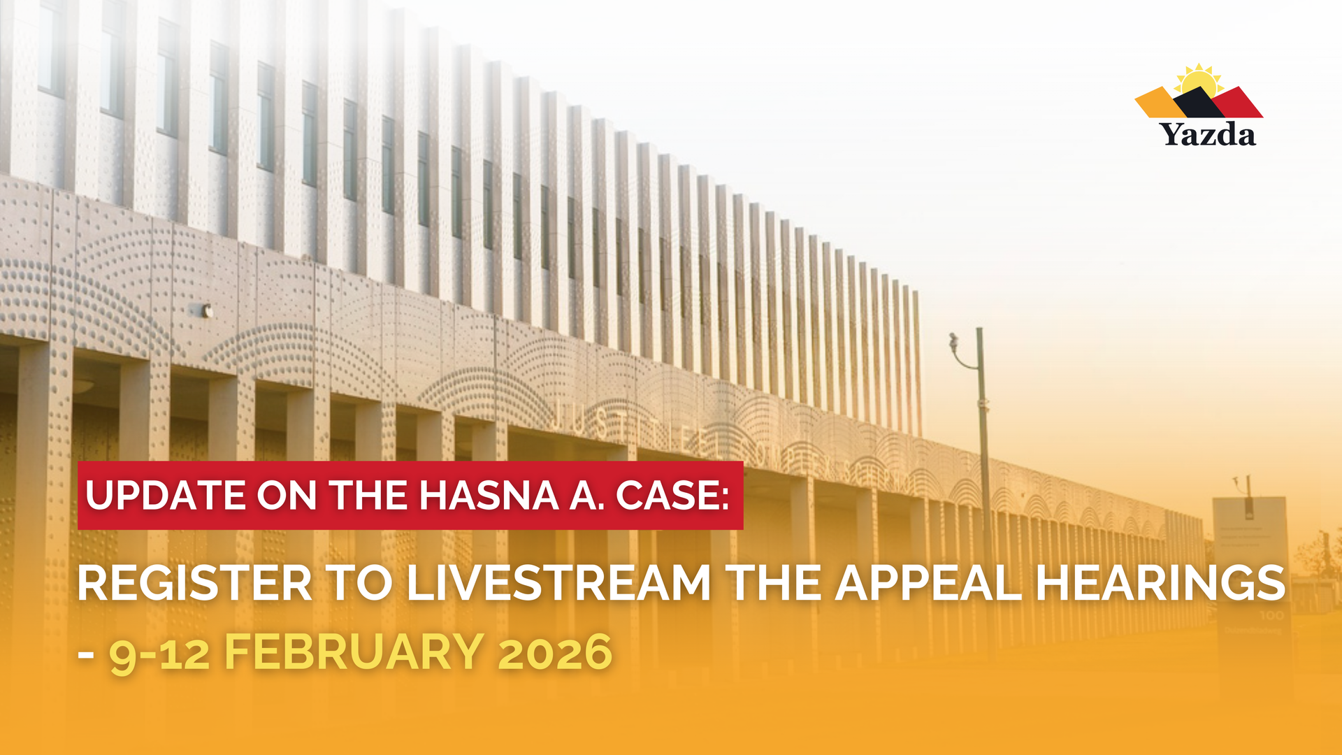 Date: 26 January 2026 Netherlands: The Court of Appeal at the Schiphol Judicial Complex will review the Hasna A. case, a landmark case involving crimes against the Yazidi community. The court made its first decision in December 2024. The defense has asked for the decision to be reviewed, hence the appeal hearings are scheduled to take place from 9 to 12 February 2026. Hasna A., a 33-year-old Dutch woman, travelled from the Netherlands to Syria in 2015 with her young son, where she married an ISIL member. She was repatriated to the Netherlands in late 2022 along with other women and children from camps in northern Syria, then arrested and charged under Dutch law. Hasna A.'s trial began in the Hague in October 2024. On 11 December 2024, the Court of First Instance delivered its verdict , sentencing her to ten years’ imprisonment for: 1) Crimes against humanity of enslavement; 2) Membership in a terrorist organisation (ISIL); 3) Participation in and promotion of terrorist crimes; and 4) Child endangerment. The case marked a milestone, as it was the first time an individual was prosecuted and convicted in the Netherlands for crimes committed against the Yazidi community. The forthcoming appeal hearings will be open to the public in person at the Court of Appeal at the Schiphol Judicial Complex and via livestream in Dutch with interpretation in Kurmanji. To request access to the live stream, please send an email to info@yazda.org with the subject line “Hasna A. case Livestream”. Once registered, you will be sent a secure link that will allow you to watch the screening. If you face any issues receiving the link, you can reach out to us at the same email address. Natia Navrouzov, Executive Director at Yazda, commented: “For Yazidi survivors, following justice processes can be deeply meaningful, but also emotionally difficult. By making the appeal hearing accessible, just as during the first-instance proceedings, through livestream, the Netherlands has taken an important step toward survivor-centered justice, one that for now remains rare. This access allows survivors to stay informed in ways that respect their choices and well-being. Yazda is committed to supporting survivors and affected communities to follow these proceedings safely, with language access, and with proper explanations.” Further updates, including the outcome of the appeal, will be shared with the community in due course. *** -END- Download this Press Release here . Read this Press Release in Arabic here. ### About Yazda: Yazda is a non-governmental, non-profit organization that was established in 2014 in response to the genocide committed by the self-declared Islamic State (ISIS) against the Yazidis and other minorities in Iraq. Yazda manages a portfolio of humanitarian, justice, advocacy, and development-related projects, all of which are community and survivor-centered in terms of design and implementation. Since its inception, Yazda has been working with local and international partners to provide humanitarian, accountability, and advocacy services to vulnerable minority groups in Iraq in their post-genocide recovery. The organization has been operating in Iraq since October 2014 and has main offices in Duhok in the Kurdistan Region of Iraq and a branch office in Sinjar in Nineveh Province. Yazda is registered as a non-profit organization in the United States, the United Kingdom, Iraq, Kurdistan Region of Iraq. Over the past 8 years, Yazda has grown to employ around 80 staff on average, received support from numerous donors, both institutional and individual, and has reached tens of thousands of direct and indirect beneficiaries through its programs and initiatives.